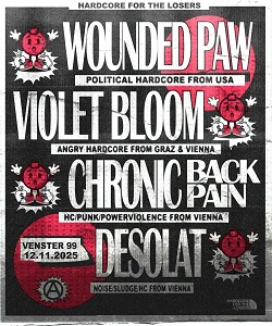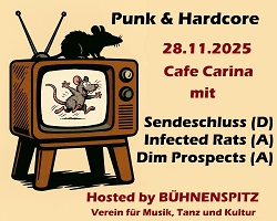 (Alle Angaben ohne Gewähr! Fehlende Termine, Änderungen & Absagen bitte melden: info[at]capeet.com) Archiv: [2025] [2024] [2023] [2022] [2021] [2020] [2019] [2018] [2017] [15.08.]: The list for Slovakia will be kept online and updated until the end of the year, then I'll re-evaluate.. KW 44: 29.10.: TORMENTED IMP (uk) / RØST @ Venster, Wien [fb] 29.10.: 24/7 DIVA HEAVEN (d) / BURNSWELL @ Arena (kl. Halle), Wien [web] 29.10.: MASS OF THE FERMENTING DREGS (jpn) @ Flucc, Wien [fb] 29.10.: Jesper Munk (d) @ Chelsea, Wien 29.10.: Tanita Tikaram (uk) @ Porgy & Bess, Wien [sold out!] [fb] 29.10.: CELESTIAL GUARD / The VELVET SWING / SALAMIRECORDER @ Kramladen, Wien [fb] 29.10.: SWANS (usa) / Jessica Moss (can) @ Helmut List-Halle, Graz [web] 29.10.: TAPE MOON @ Café Wolf, Graz [fb] 29.10.: Edna Million @ Bar-Café Hildegard, Kirchdorf an der Krems 29.10.: WORMROT (sgp) / GUMMO (fra) / DISTASTE @ Rockhouse Bar, Salzburg [fb] 29.10.: NYOS (fin) @ 30.10.: HIGH ON FIRE (usa) / NECROT (usa) @ Arena (gr. Halle), Wien [fb] 30.10.: INTRA / MOTIONSICK @ Arena (DreiRaum), Wien [fb] 30.10.: DEAR DEER (fra) / RIO OBSKUR @ Das Lot, Wien [fb] 30.10.: AD INFINITUM (ch/d) / SEVEN SPIRES (usa) / PHANTOM ELITE (ned/d) @ Szene, Wien [fb] 30.10.: ROME (lux) @ Viper Room, Wien [fb] 30.10.: WELL / YOUR GORGEOUS SELF @ Coco Bar, Wien 30.10.: COVVES (d) / LIGHTTS @ Kramladen, Wien [fb] 30.10.: TAPE MOON / Philomena Juen @ rhiz, Wien [fb] 30.10.: TORMENTED IMP (uk) / INDIKATOR B (cro) / The SNUB @ SUb, Graz 30.10.: VIOLET BLOOM / KRUST HUNY / MANTRA @ Club Wakuum, Graz [fb] 30.10.: 24/7 DIVA HEAVEN (d) / SOLO ONO (nzl/aut) / Dennis Jagard (usa) @ Music-House, Graz [fb] 30.10.: ALAGO / PHAL:ANGST @ Kunst Klub Kräftner, Graz 30.10.: Jesper Munk (d) @ p.p.c., Graz [fb] 30.10.: PAULS JETS @ ARGEkultur, Salzburg [fb] 31.10.: MONGREL ARMY / MINER SWEAT / ASSPLAY / MODERN CORNBALL @ Venster, Wien 31.10.: PILE (usa) / HEISA (bel) @ Lucia, Wien [fb] 31.10.: JADU HEART (uk) / TV (uk) @ Flex (Café), Wien [fb] 31.10.: The CREEPING TERRORS (uk) @ Weberknecht, Wien [fb] 31.10.: Salamirecorder & The HI-FI PHONOS / The RED RAIN @ Chelsea, Wien [fb] 31.10.: ALAGO / PHAL:ANGST @ Kramladen, Wien [fb] 31.10.: IRON SNAG JOE / The PEW PEW LASERGUNS (d) / DISCORRECTED @ Café Carina, Wien [fb] 31.10.: The COVER FIENDS @ Celeste, Wien [fb] 31.10.: PARADISE LOST (uk) / MESSA (ita) / LACRIMAS PROFUNDERE (d) @ Simm City, Wien [sold out!] [fb] 31.10.: NOAPOLOGY (ukr) / XONOR (ch) / VINEGAR HILL / Zascha / Fanni @ Szene, Wien [fb] 31.10.: Mel D (ch) @ rhiz, Wien [fb] 31.10.: KNOCHENFABRIK (d) / KOCHKRAFT DURCH KMA (d) / The BLOODSTRINGS (d) u.a. @ Last, Linz [fb] 31.10.: HANGOVER IN MINSK (pol) / ELLEREVE (d) / SATURNISTS @ Club Wakuum, Graz [fb] 31.10.: DARKFALL / SENNTUS / VARULV / MORITURI @ Tenne, Leoben [fb] 31.10.: STRAY DOGS (d) / JAWBREAKER (aut/ita) / ABDITORY / SCORN (int) @ Klang-Film-Theater, Schladming 31.10.: CANNONBALL RIDE / HENGRENADE / DEAD SPARROW COLLECTION / The SPOOKY GUESTS @ RAWS-Diner, Attnang-Puchheim [fb] 31.10.: FRANZ FUEXE / Die ÄNDERUNG @ Kino, Ebensee [web] 31.10.: MOON WOMAN / SUCCOPUSS @ Treibhaus, Innsbruck [web] 31.10.: Batman & The MIGHTY ANTI-HEROES / BOSS BRAIN TWISTERS @ Engel, Dornbirn 01.11.: PRECIPICE (fra) / NOHZ (fra) / STUHLKREIS @ TüWi, Wien [fb] 01.11.: DISCURE / SATURNISTS / ELLEREVE (d) @ Venster, Wien [fb] 01.11.: ENTER SHIKARI (uk) / DEATHBYROMY (usa) @ Simm City, Wien [fb] 01.11.: ACHT EIMER HÜHNERHERZEN (d) / IEDEREEN (d) @ Flex, Wien [fb] 01.11.: LOS FASTIDIOS (ita) / 2ND CLASS SUBSTITUTES @ Arena (kl. Halle), Wien [fb] 01.11.: ERŐSZAKSZERVEZET (hun) / FUCKING COMPLEX @ Arena-Beisl, Wien [fb] 01.11.: SPORTY BOYS / REBELL BAGATELL @ Chelsea, Wien 01.11.: LOS BILLTONES (ch) / KROOKED TOOTH @ Aera, Wien [fb] 01.11.: The PARASCOPES / PONDSKATER @ G5, Wien [fb] 01.11.: CLEOPATRICK (can) / CHASTITY (can) @ Szene, Wien [fb] 01.11.: PAULS JETS / JEANSBOY @ Flucc, Wien [fb] 01.11.: ADELITA ESCAPES & Jul Dillier / Marilies Jagsch & Manuel Riegler @ Chateau Rouge, Wien [fb] 01.11.: ALAGO / PHAL:ANGST @ Secret Location, Linz 01.11.: DRAGGED INTO SUNLIGHT (uk) / ELDAMAR (nor) / NEL BUIO (ita) / VRDRBR (d) u.a. @ A. Schl8hof, Wels [sold out!] [fb] 01.11.: SCHLIMM (d) / FEALE (d) @ SUb, Graz 01.11.: KOCHKRAFT DURCH KMA (d) / FEDER @ Music-House, Graz [fb] 01.11.: BLINDGODS / KALLIOTA / BLOODWÖRST @ Club Wakuum, Graz [fb] 01.11.: ULTIMA RADIO / LILAC VEGETAL / BORDËRLANE @ Kulturhof, Villach [fb] 01.11.: STESY / EMBRACE THE FIRE / KNOCKOUT CONCEPT / FALLEN APART @ Livestage, Innsbruck [fb] 01.11.: GALLOWHEAD / GRAUREIHER @ Antiquariat Chybulski, Feldkirch [fb] 01.11.: YOWIE (usa) @ rhiz, Wien [cancelled.] 01.11.: SON MIEUX (ned) @ Flex, Wien [cancelled.] 02.11.: AFSKY (den) / MYRDAL (d) @ Viper Room, Wien [fb] 02.11.: AGGREVIL (slo) / DIVINITY PROTOTYPE / LIVEREGGA (slo) @ Replugged, Wien [fb] 02.11.: JAKUZI (tur) @ The Loft, Wien 02.11.: Ethel Cain (usa) / 9MILLION (can) @ Gasometer, Wien [sold out!] [fb] 02.11.: Johnny Marr (uk) / The CLOCKWORKS (irl) @ Simm City, Wien [fb] 02.11.: The MUDDY MOON @ Chelsea, Wien 02.11.: Sonntag'sdisco feat. CUTE AGGRESSION @ Flucc, Wien [web] 02.11.: PROFANATICA (usa) / SPITER (usa) @ Kapu, Linz [fb] 02.11.: JULIA EFFEKT @ Flucc, Wien [cancelled.] [neu: 02.12.] KW 45: 03.11.: KOCHKRAFT DURCH KMA (d) / HALS MAUL @ B72, Wien [fb] 03.11.: LEUCHTSTOFF (d) @ rhiz, Wien [fb] 04.11.: PROFANATICA (usa) / SPITER (usa) / OTRAS (cze) @ Escape, Wien [fb] 04.11.: STRAY FROM THE PATH (usa) / ALPHA WOLF (aus) / GRAPHIC NATURE (uk) / CALVA LOUISE (uk) @ Simm City, Wien [fb] 04.11.: LARKIN POE (usa) / SON LITTLE (usa) @ Gasometer, Wien [fb] 04.11.: COMBAT BEACH @ Ateliertheater, Wien [web] 04.11.: JAYA THE CAT (ned) / PUBLIC SERPENTS (usa) @ p.p.c., Graz [fb] 04.11.: SURLY BLISS @ Café Wolf, Graz [fb] 04.11.: LIFE OF AGONY (usa) / UGLY KID JOE (usa) @ Conrad Sohm, Dornbirn [fb] 04.11.: STREET SECTS (usa) / Lana Del Rabies (usa) @ rhiz, Wien [cancelled.] 05.11.: LIFE OF AGONY (us